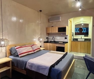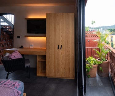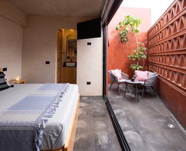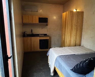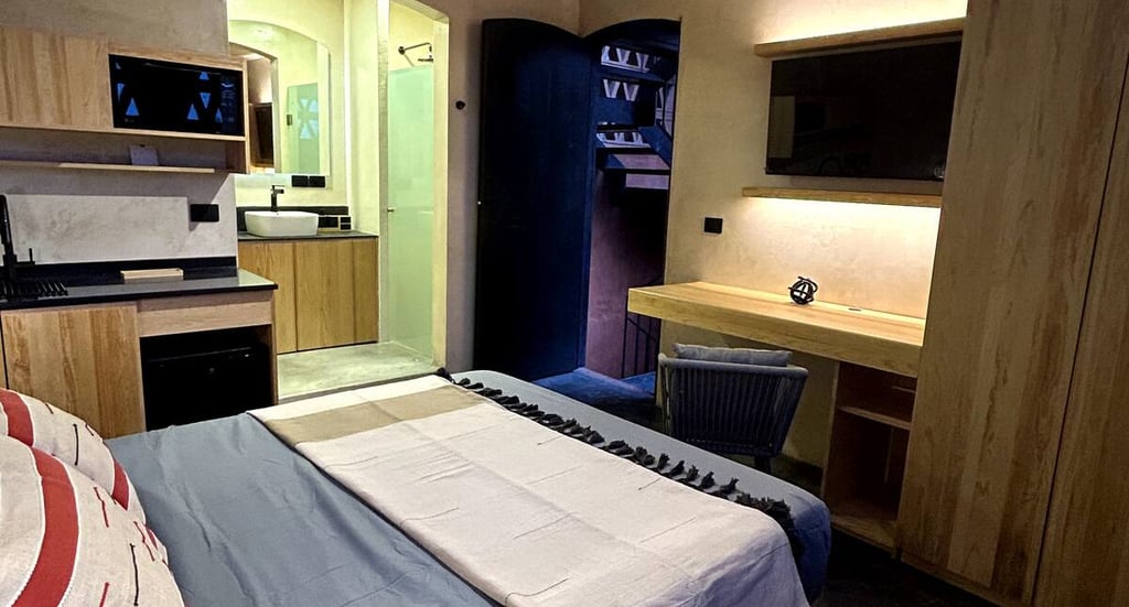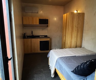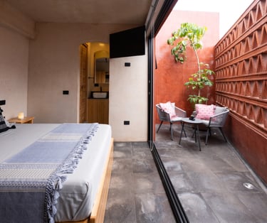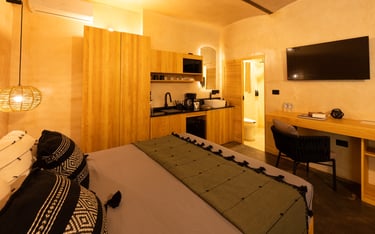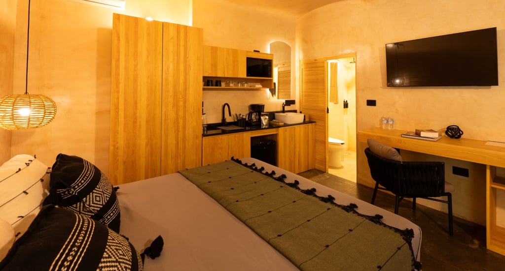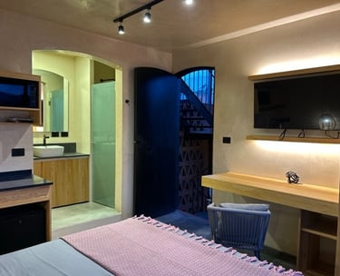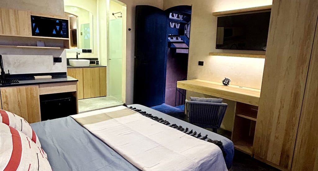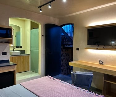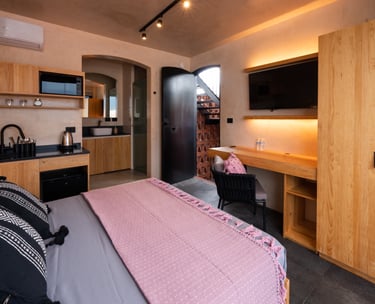 Esta habitación ofrece un ambiente acogedor y moderno, ideal para relajarse después de un día explorando Oaxaca, con todas las comodidades necesarias para una estancia placentera.